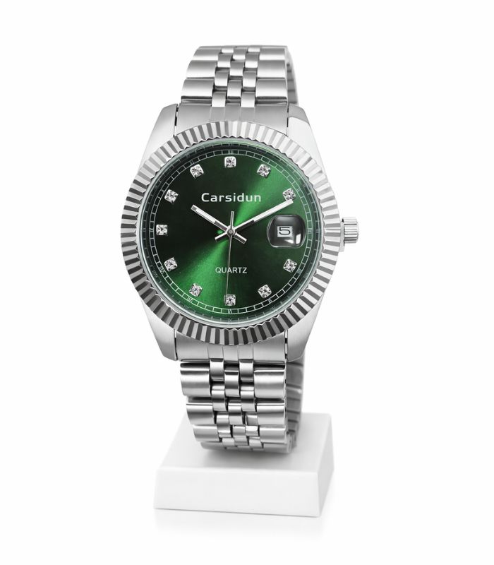 Carsidun Menβs Analog Quartz Watch with Green Dial | Stainless Steel Strap | Date Display